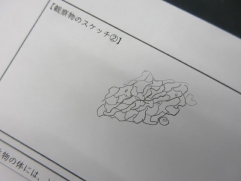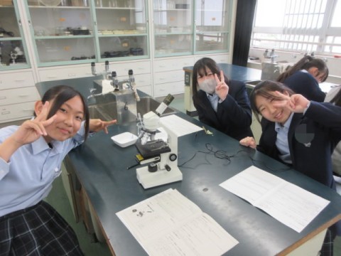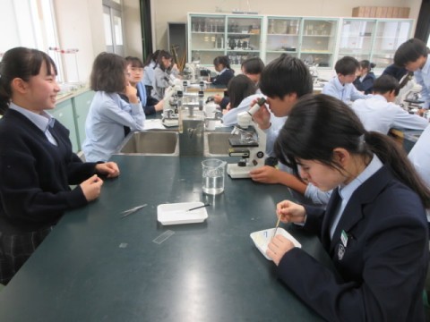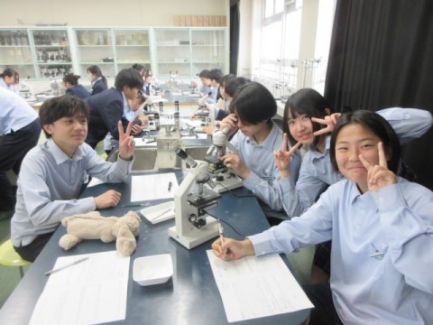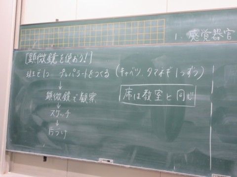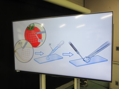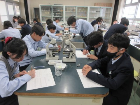 理科室で顕微鏡を使い、「たまねぎ」「キャベツ」の細胞を調べています。