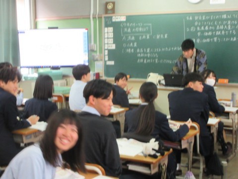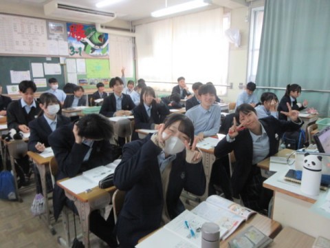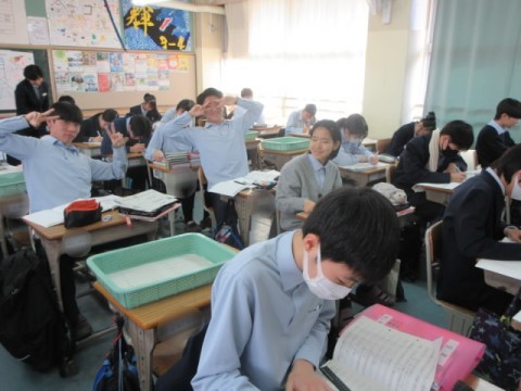 2年生の給食の写真を撮るために廊下を歩いていたら、下校途中の3年生が緑道から思わずポーズ!