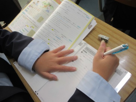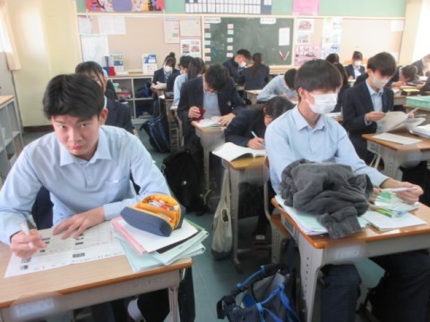 リコーダーのテストと期末テスト対策のプリントをしています。