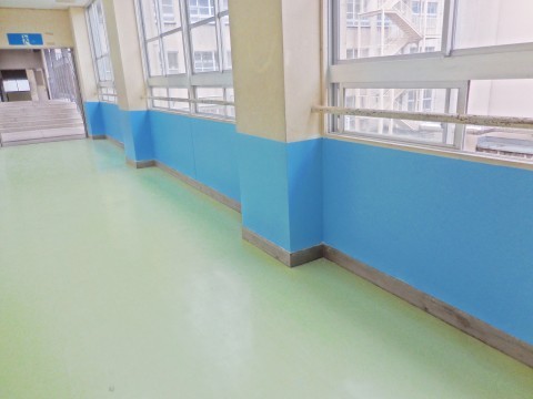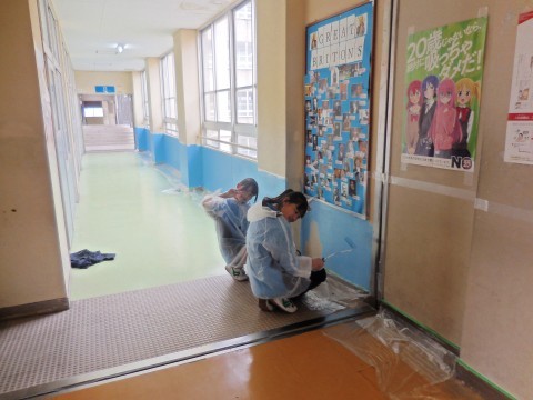 本日は,図書室前・職員室前です。塗っている階や場所によってペンキの色は変えています!