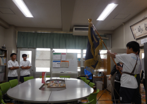 明日の体育大会に向けて,生徒会役員が校長室で校旗の準備をしています。