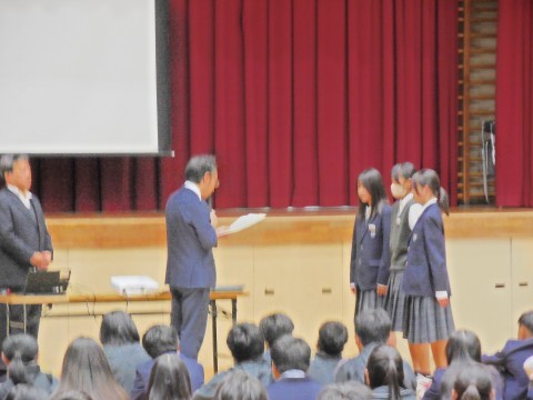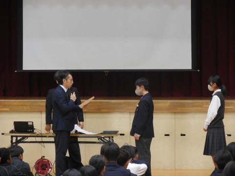 修了式の前に表彰伝達を行いました。堺っ子書道展,連合書初展,堺市教育委員会表彰,陸上部,サッカー部など晴美台中学校の生徒がさまざまな場面で活躍しています!