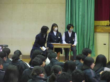 校長先生のお話と生徒指導の先生のお話を聞きました。今年度最後の集会で、晴美台中学校の明るい未来を感じることができました。 -