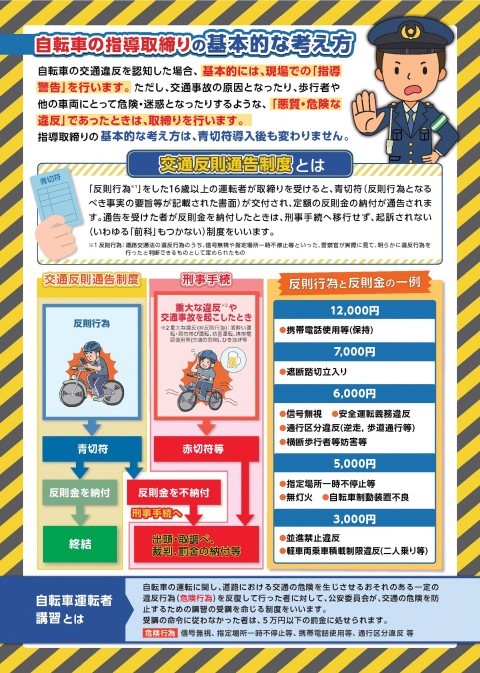令和8年4月1日より16歳以上の自転車の交通違反に「交通反則通告制度(いわゆる青切符)」が導入されます。自転車の信号無視,一時不停止,携帯電話の使用(保持),イヤホン使用,無灯火,傘をさしての片手運転,等の交通違反に対して,自動車同様に反則金を納めることになります。