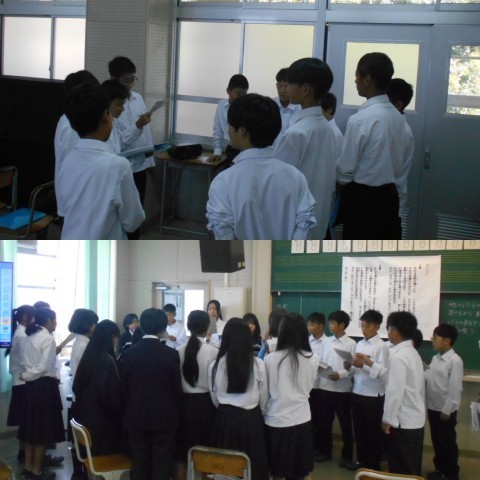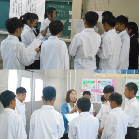 教室内に着目して、改善したらよい点などを班で検討しています。