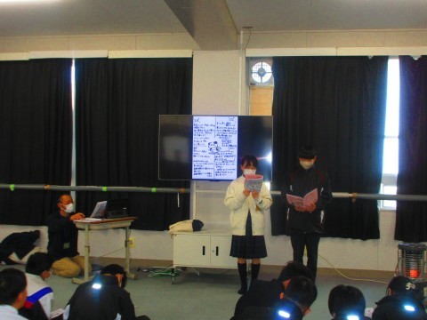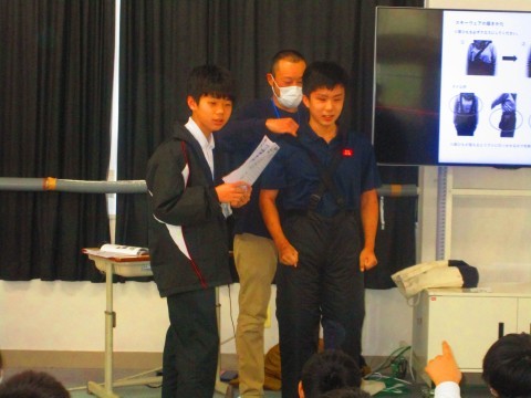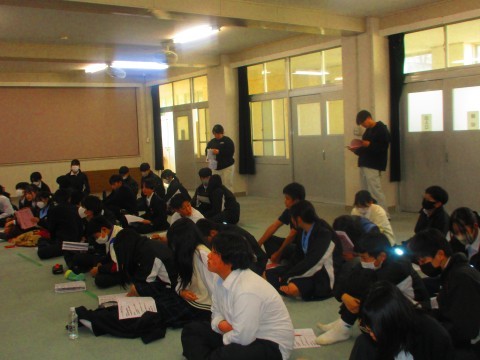 校長先生のお話の後、生徒会から先日行われた堺市中学校リーダー講習会の報告。
