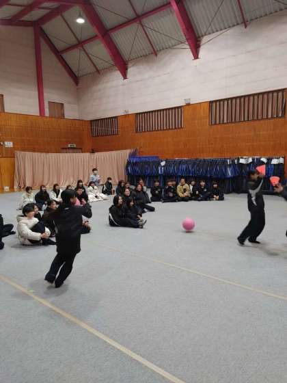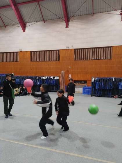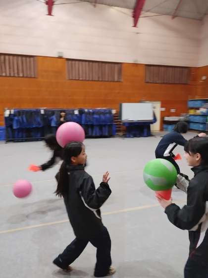 次のゲームは、ボールをたくさん落とされたら負けのゲームはです。走り回りながら、相手のボールをうまく落とそうと工夫しています。でも、懸命に走ると自分のボールが落ちてしまうんですよね。このゲームも盛り上がっています。