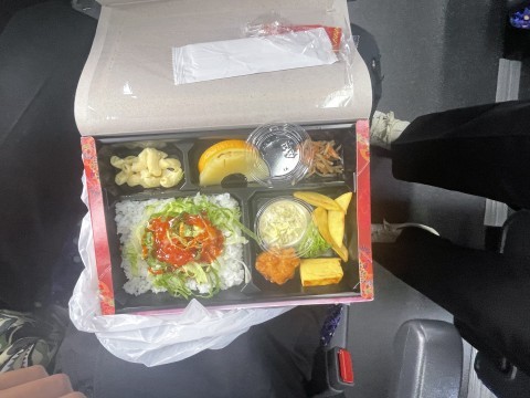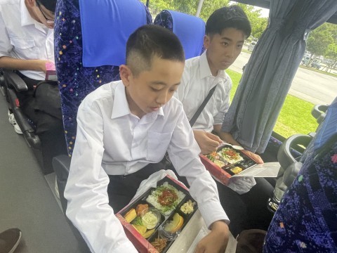 暑さ対策のためバス内で昼食をいただきます。