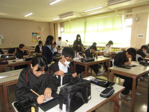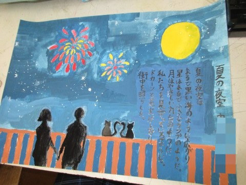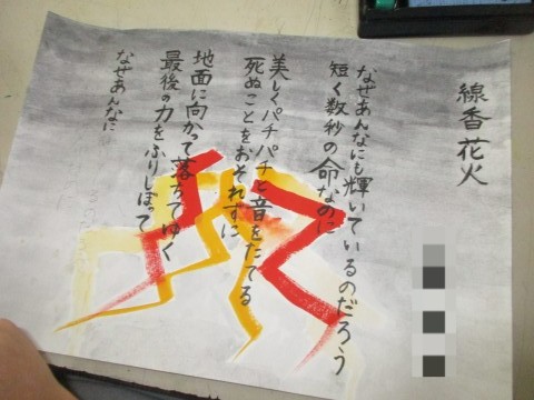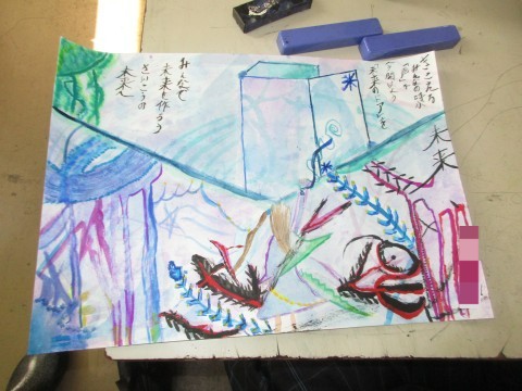 今日の学習は書道、美術で描いた風景画の上に小筆(毛筆)で詩を書くこと。