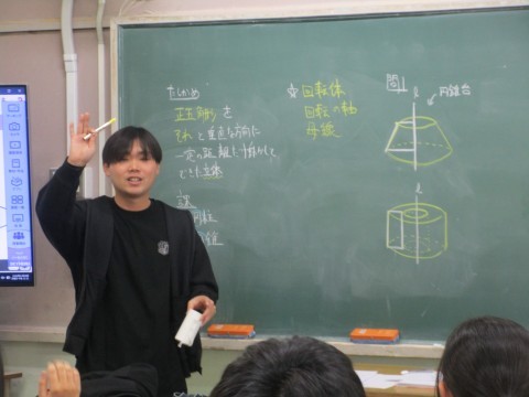 軸より1回転させた回転体の見取図を書き、平面図形と立体の関係を理解しています。