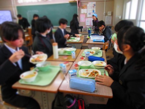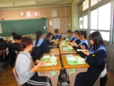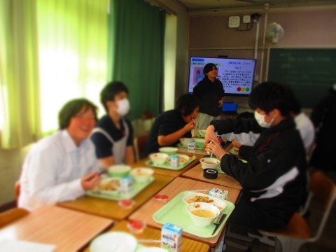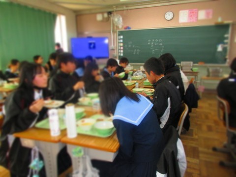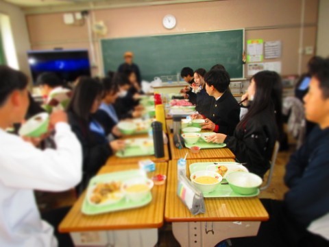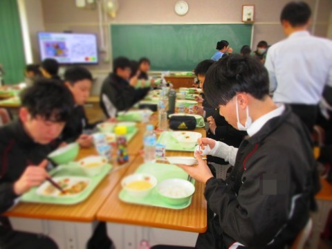 給食を食べながら、和やかな時間を過ごしています。
