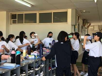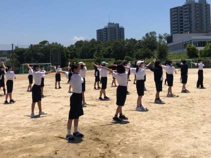 水分補給を行いながら、グランドでラジオ体操の学習を行っています。