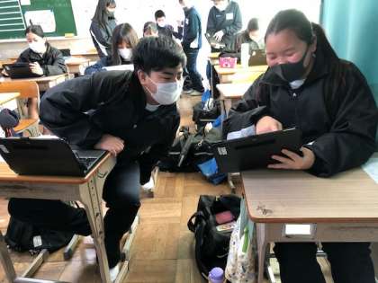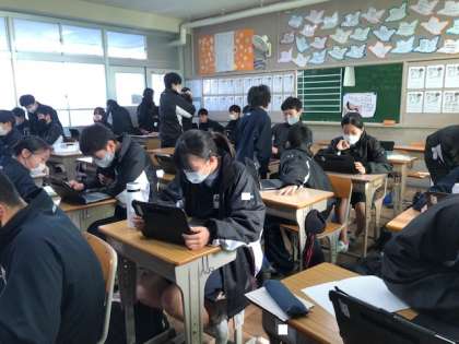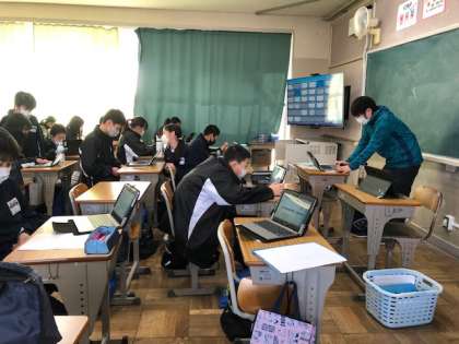 5時間目の国語の授業をスムーズに進めるため、パソコンを立ち上げ、準備をしています。