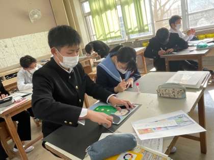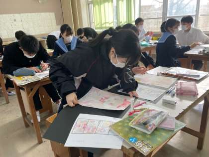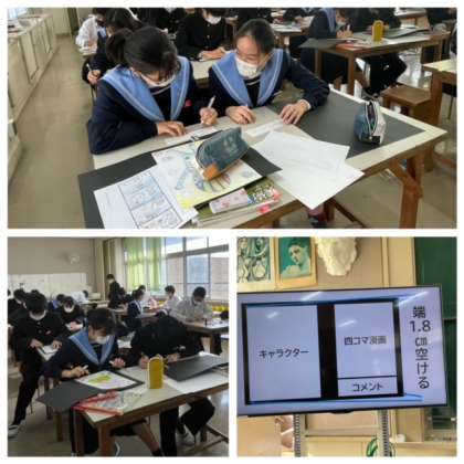 美術の授業で取り組んだ、マイチャラクターと4コマ漫画を展示します。