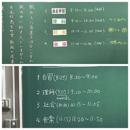 今日のテストは、理科と社会、1、3年生は音楽のテストも実施します。