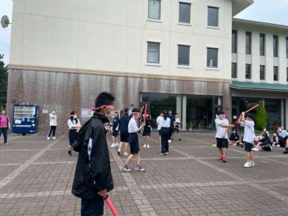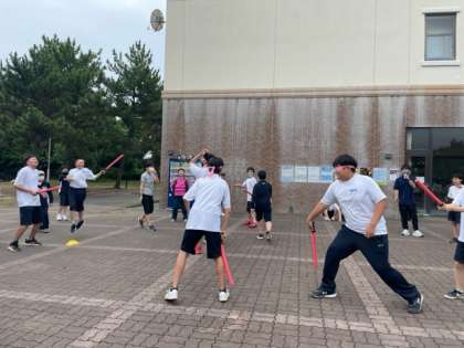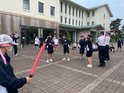 目隠しをしてみんなの指示を聞いてスポンジの剣を相手に当てます。