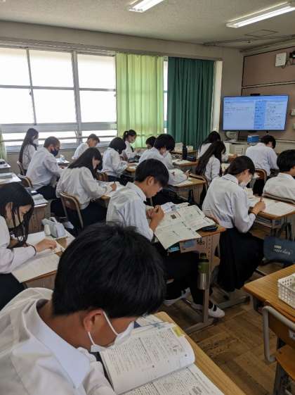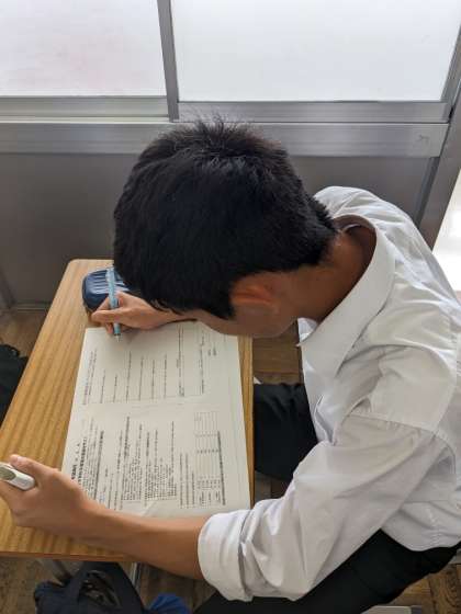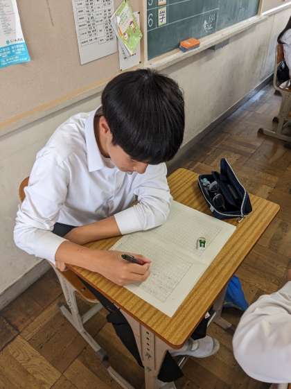 3年生には、本日1回目の進路希望調査が配られています。自分の進路について、時間をしっかりかけて考えていかないといけませんね。総合の時間には、来週の期末テストに向け、集中して学習に取り組む姿が多くみられます。