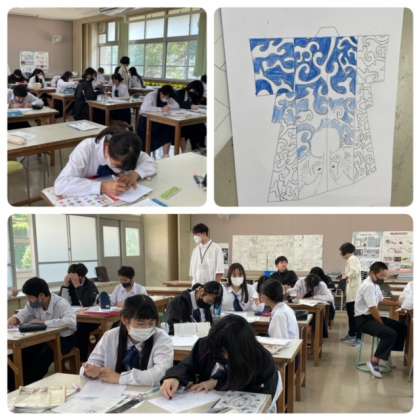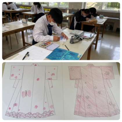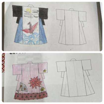 前時に書いた「着物デザイン」をもとに色づけを行い、和模様を表現しています。