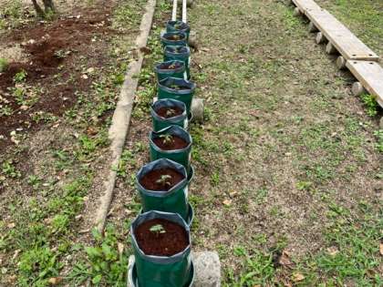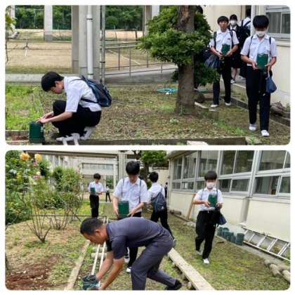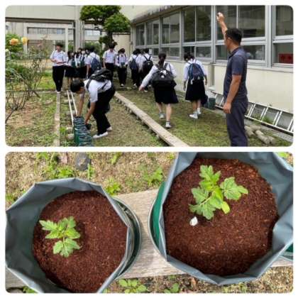 本日、技術家庭科のテスト終了後、技術室で栽培していたミニトマトの苗を屋外に出しました。