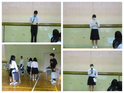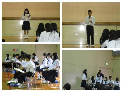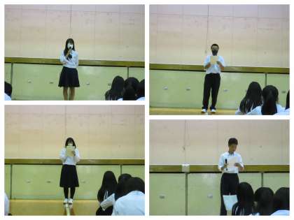 まず生徒会の活動案の報告を生徒会長のIさん、引き続き学級代表Tさん、風紀委員会Sさん、環境委員会Tさん、体育委員会Mさん、文化委員Yさん、保健安全委員Hさん、選挙管理委員会Fさんが活動報告を行い、全ての報告が承認されました。