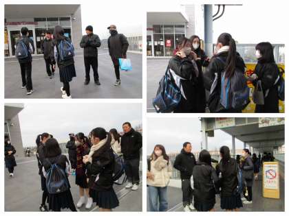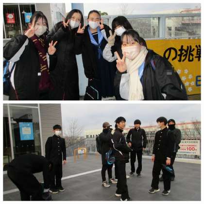 栂・美木多駅で先生たちの激励を受け私立高校入試にむかう3年生。