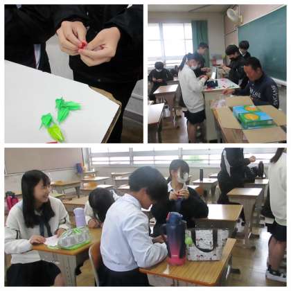 3年生の修学旅行実行委員のメンバーは担当の先生と千羽鶴を作製してます。