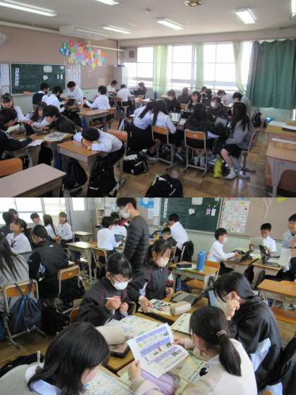 2年2組、校外学習(堺めぐり)にむけて、各班でルートを考えています。タブレットで検索したり、マップとにらめっこしたり……話し合いが続いています。
