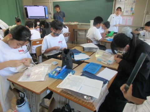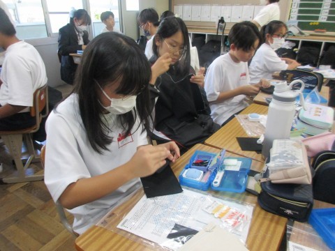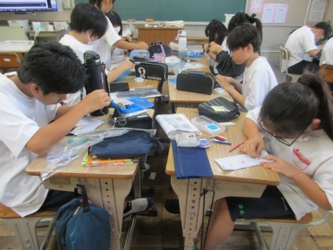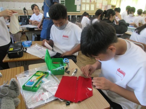 ペンケースを作製しながら、まち針の打ち方、玉どめ、玉結び、なみ縫い等を習得。