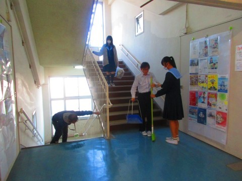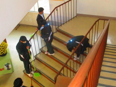 階段の隅の汚れを激落ちスポンジで磨く1年生。
