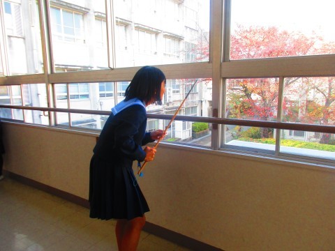 窓サッシに絡まる蜘蛛の巣を取り除く2年生。