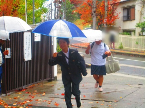 紅葉が美しく色づき、秋の深まりが感じる中での登校。