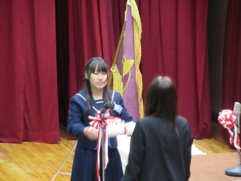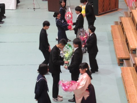 また、PTAから記念品(証書フォルダー)の贈呈、3年生PTAから3年生担当の教員に花束をいただきました。