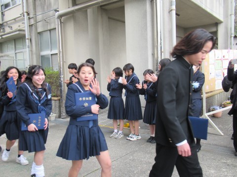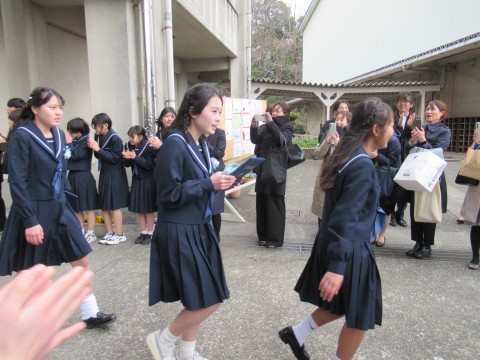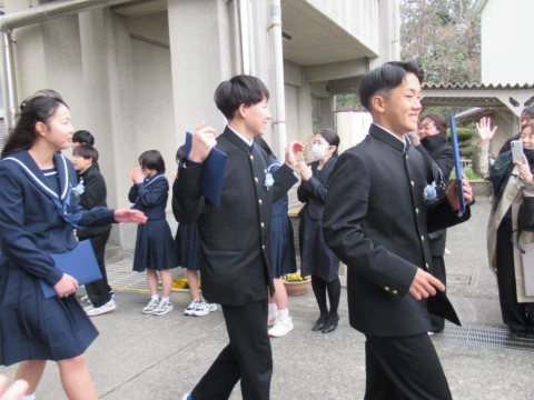 在校生や保護者のみなさまがつくる花道から卒業生が巣立ちました。