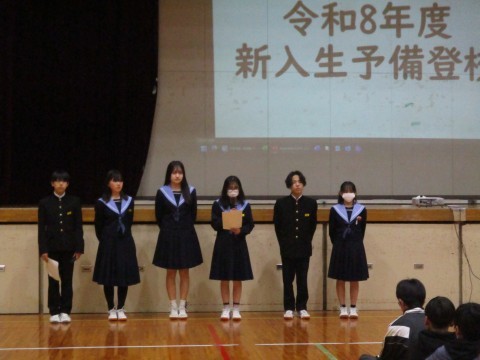 昨日原山ひかり小学校の卒業式を終えた児童たち。本日、中学校への予備登校ということで、本校の門をくぐりました。体育館では、まずO先生からの今日の流れについての説明。その後、一人ひとりに名札が配布されました。また、生徒会執行部のみなさんが作成したパワーポイントをもとに、標準服の着こなし方や行事等学校生活についての説明がありました。