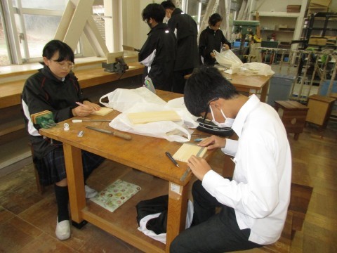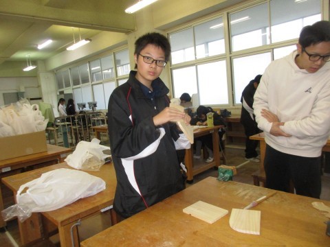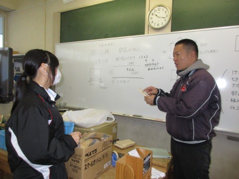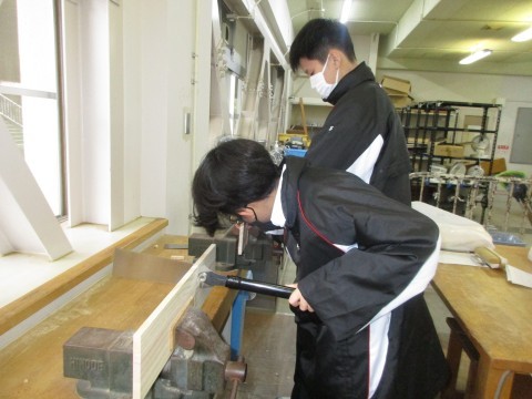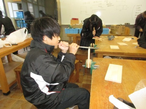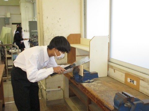 多くの生徒は、木材の切断や穴あけ、やすり等部品の加工を行っています。