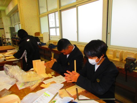 前時から続くフォトラックづくりの木工学習。