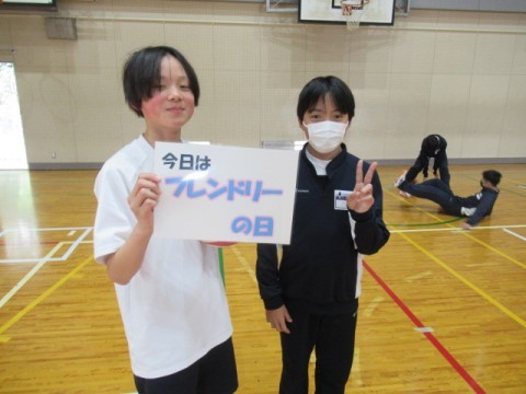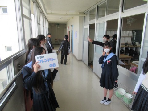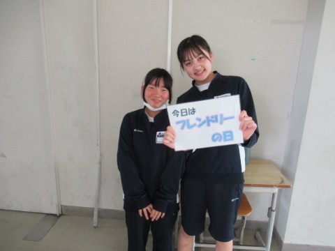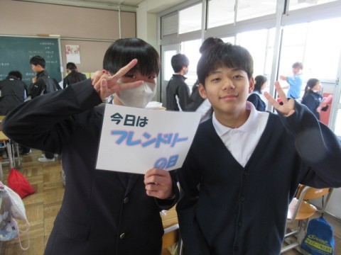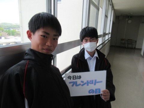 2年生に「今日はフレンドリーの日ですよ。」と言って、プレンドリーPOPを渡すと、