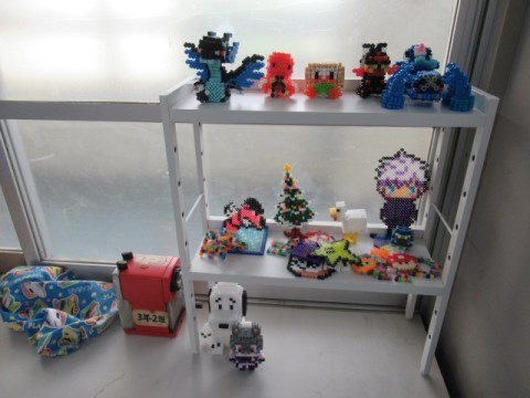 窓際の棚には、あすなろメンバーが制作したアイロンビーズがありました。