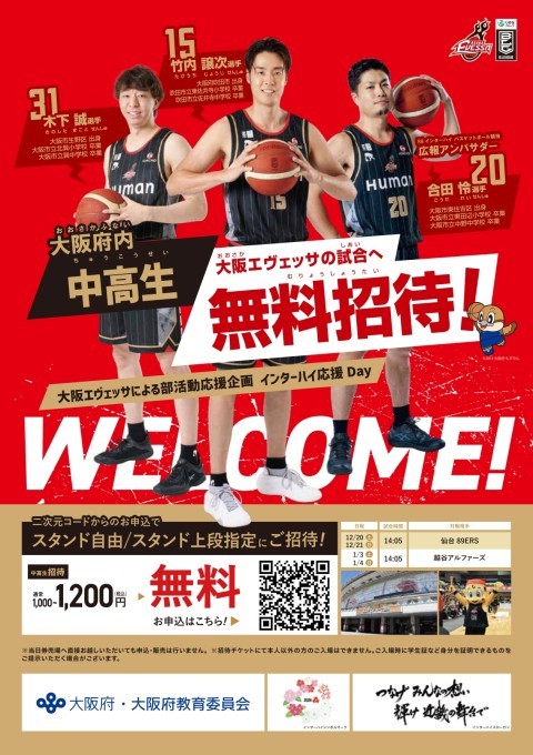 大阪エヴェッサによる部活動応援企画「インターハイ応援Day」への府内中高生無料招待についての案内がありました。