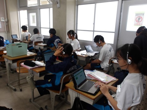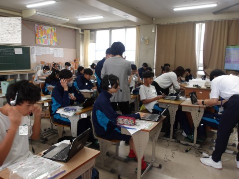今日は4組で実施。業者の方や他学年の英語科の先生、教育実習生がサポートに入り、無事スタートしました。