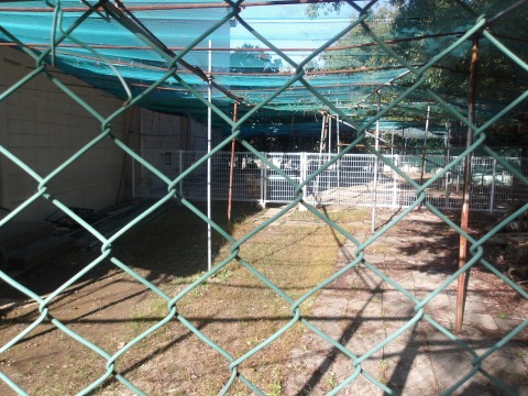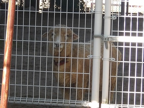 今日は残念ながらノー放牧デー。サンが日陰でちょこんと座っています。