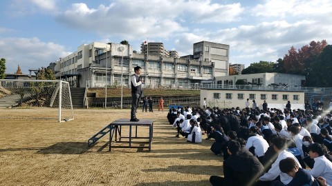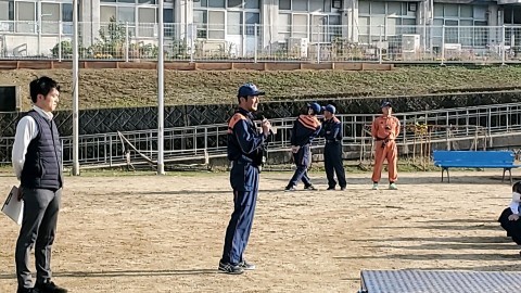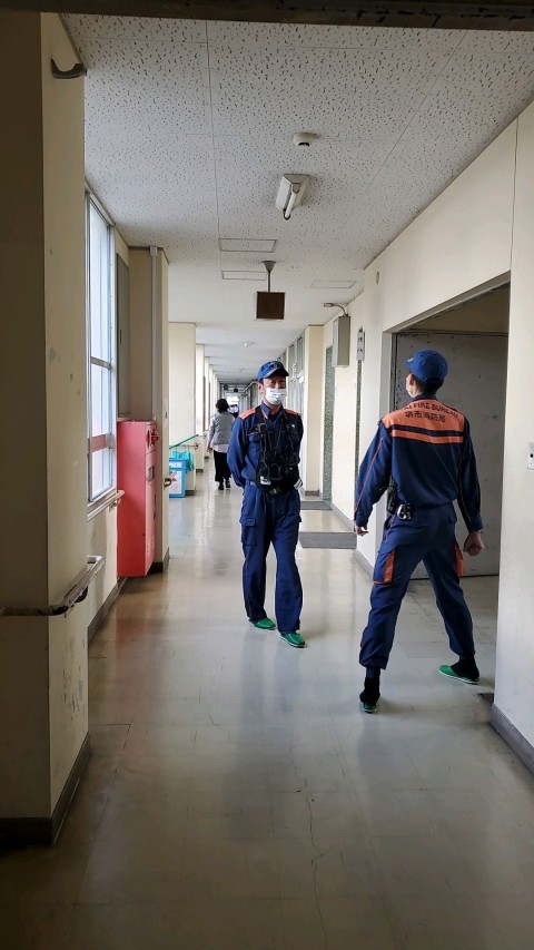 本日午後、南堺消防署の方4名にお越しいただき、震度6強の地震と第一理科室から火災が発生したとの想定で避難訓練を実施しました。生徒は廊下に整列し、先生の指示に従って避難しました。