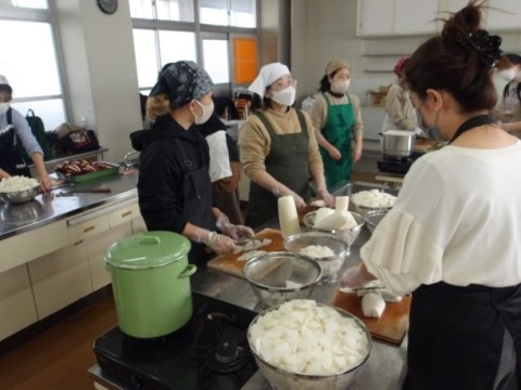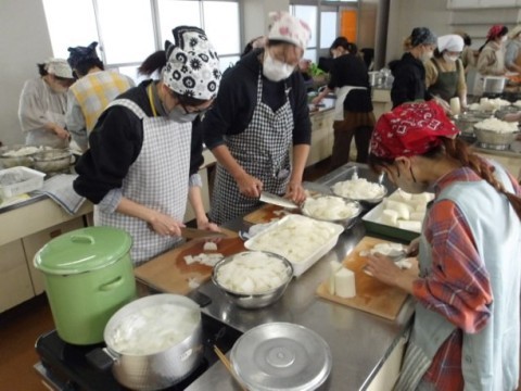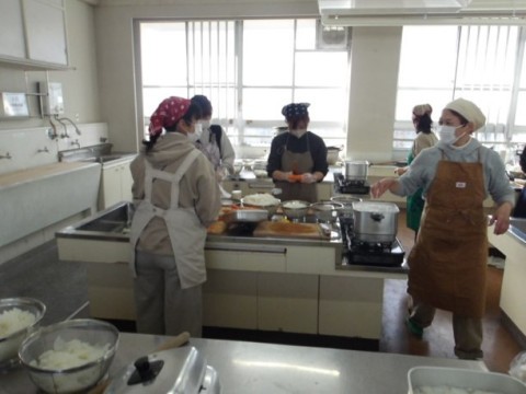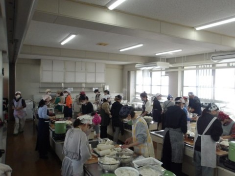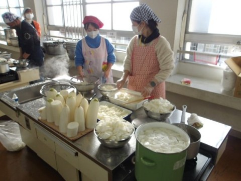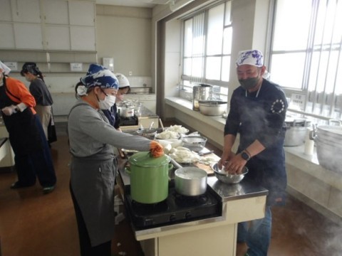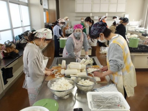 本日午前中から家庭科室にて収穫祭で提供する豚汁の下準備をPTAの皆様で行っている様子です。
