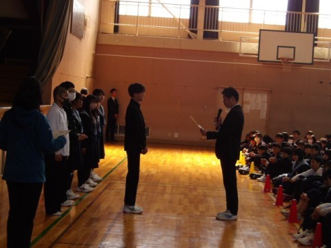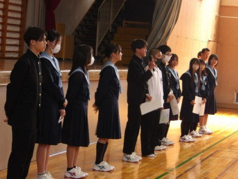 4/8(水) 認証式 公開日 2026/04/08 更新日 2026/04/08 お知らせ 令和8年度前期生徒会役員が認証されました。そして,令和7年度後期と令和8年度前期の入れ替わりました。新会長より決意のあいさつがありました。全校生徒で協力して,よりよい美木多中学校をつくっていきましょう。
