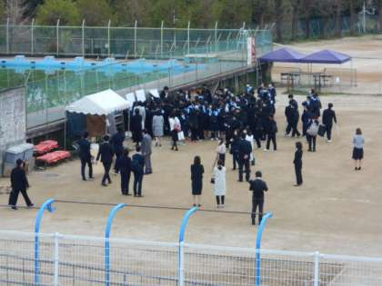 新1年生が順次登校してきました。 グラウンドでクラス発表です。