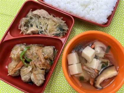 【献立】 ごはん 肉団子の甘酢あんかけ タンタン春雨 豆腐スープ 牛乳 おいしくいただきました。