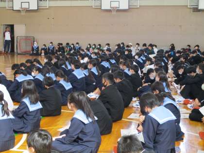 1年生が、前のめりに各クラブの先輩たちの部活動の紹介とパフォーマンスを見ています。