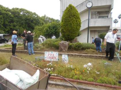 午前10:00からPTA環境委員のみなさまにお集まりいただき、正門正面にあるPTA花壇の花の植え替えを行いました。