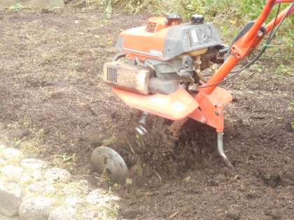 堆肥と肥料をまき、耕運機で土を起こしながら撹拌します。