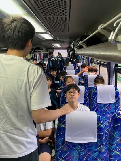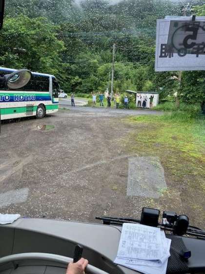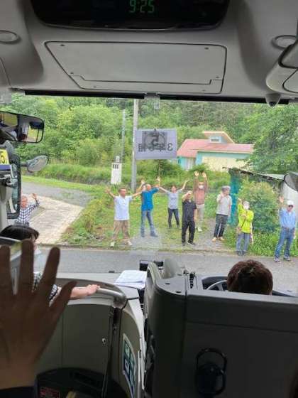雨も上がりました。点呼(写真上)をして、出発です。宿舎の皆さまがお見送りしてくれています。(写真中下)